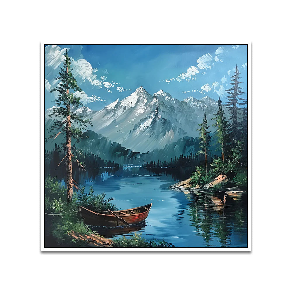 Snow Capped Mountain Nature Painting with Boat, Trees for Home Décor